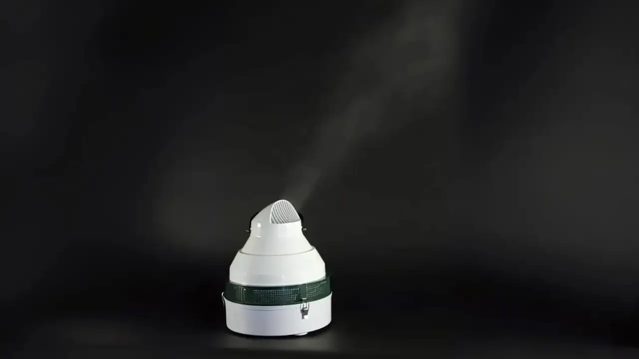 Hydrofogger with Multi-Directional Fogging Head. Measures 17.25″ tall (with fogging head) x 14″ in diameter. Dry weight is 15.25 lbs. Coverage is up to 2000 ft2, depending on humidification requirements and ceiling height. Output is approximately 1.05 gallons per hour or 200 pints per day. Circulates 340 cubic feet per minute (cfm).
